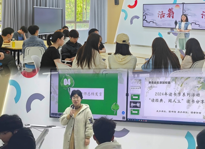 活动最后,倪聆老师做了三点总结:一是“读经典,阅人生”读书分享会作为一个交流的平台,让热爱读书的同学在文字的海洋中遨游,感受不同的人生百态,分享读书的乐趣和心得,正如《活着》中的主人公一样,尽管历经磨难,他依然坚韧地活着,通过阅读这些作品,我们能够更加珍惜生活中的美好时光,对处于困境中的人多一份理解和同情;二是,我们把活动地点放在学校新建的智慧教室,体验一下现代化的教学设备,进一步激发了大家参与阅读活动的热情;第三,“读经典,阅人生”读书分享会也是今年常州纺院第十五届读书节的系列活动之一,后续还将举办“书影随行”、“书海寻宝“、“我是常纺讲书人”演讲比赛、“盛世华章,笔墨流芳”书法作品征集和展览、经典诗词朗诵比赛、信息素养大赛、论文写作讲座等更多精彩活动,希望同学们积极参加。