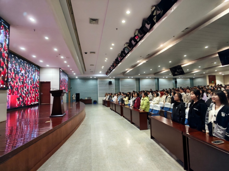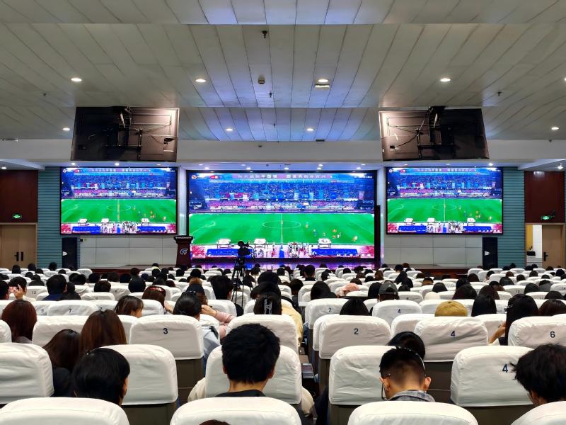 为丰富学生文体活动形式,鼓励学生积极参与体育运动,牢固树立“健康第一”的理念,4月11日晚,校团委组织450名学生在报告厅集中收看了2026江苏省城市足球联赛(“苏超”)开幕式暨揭幕战直播。